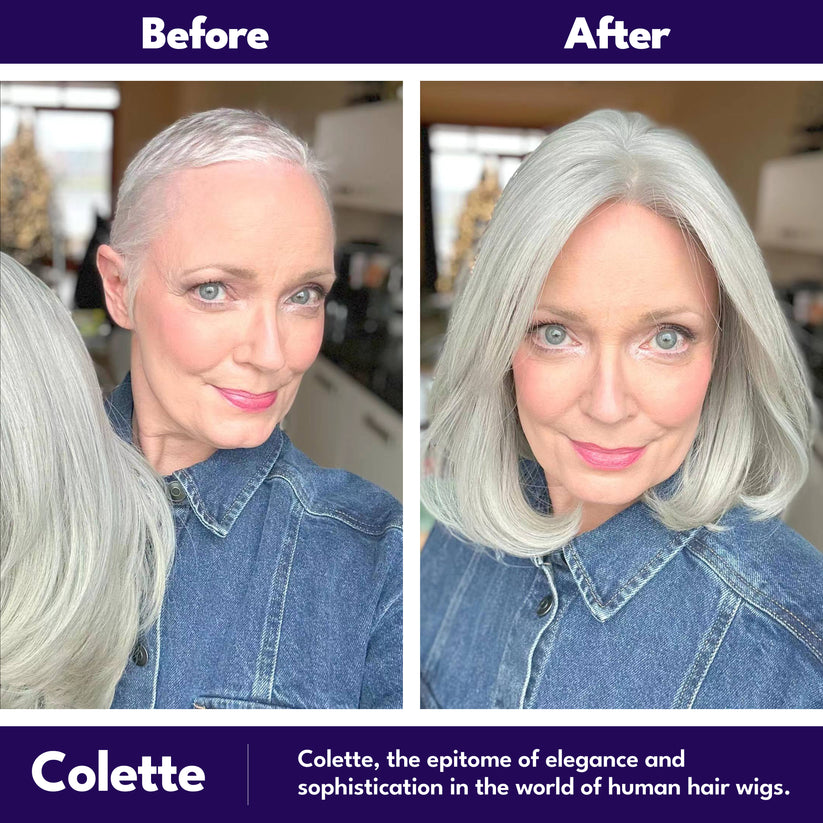 COLETTE is a 15” layered wig in a natural silver salt & pepper blend, combining sleek silver with soft grey for a timeless and sophisticated look. Over-the-shoulder layers create movement and dimension while the lightweight silk-insert lace top and velvet-lined cap ensure comfort and versatile styling. Perfect for everyday elegance or special occasions, this wig enhances natural beauty with effortless sophistication.
