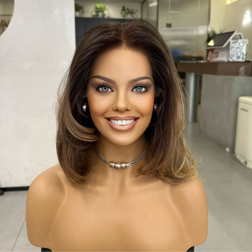 JESSICA es una peluca en capas de 45 cm que combina un rubio champán con cálidos reflejos caramelo para un look bronceado y de fácil mantenimiento. El ombré de raíces oscuras garantiza una transición natural y un mantenimiento sencillo, y las suaves ondas en capas aportan movimiento y dimensión. Ligera y cómoda, cuenta con una gorra sin pegamento forrada de terciopelo con un forro de seda opcional, lo que te permite peinarla con total libertad para el día a día o para ocasiones especiales.