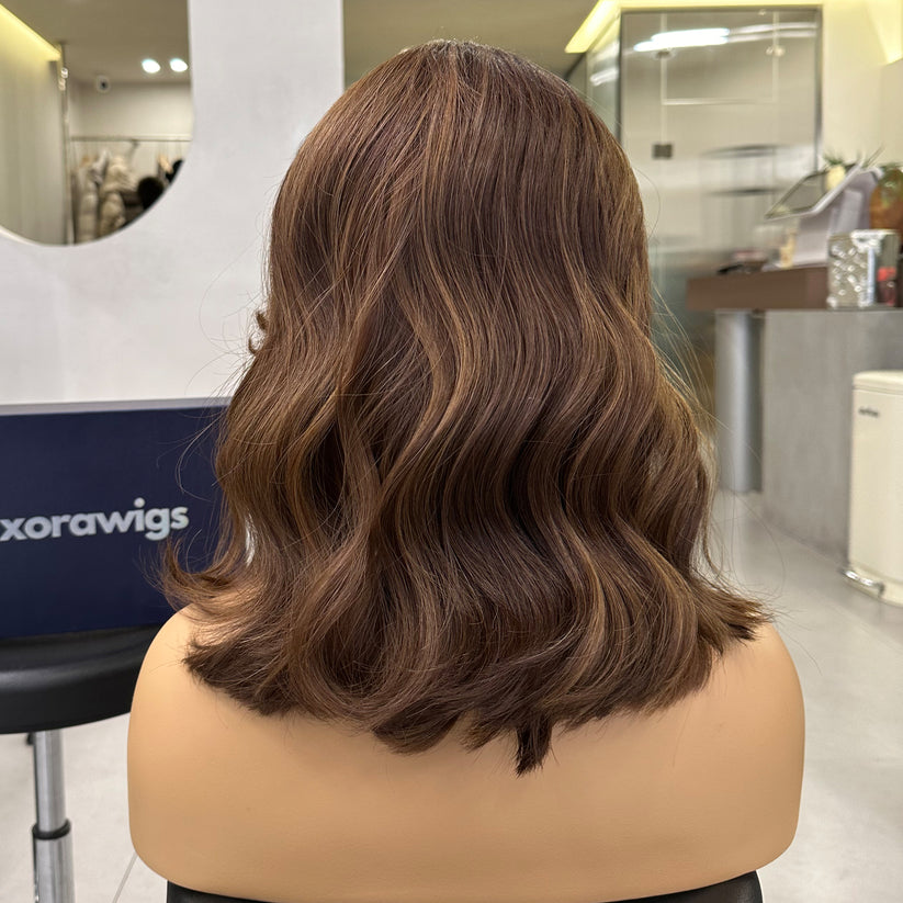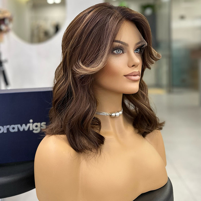 SYLVIA es una peluca de 40 cm que combina el castaño natural con reflejos sutiles y raíces castaño oscuro para un look intenso, dinámico y sofisticado. Las suaves ondas en capas aportan volumen y movimiento, mientras que la parte superior de encaje ligero y la gorra sin pegamento ofrecen comodidad y un peinado versátil. Perfecta para el día a día o para ocasiones especiales, SYLVIA realza la belleza natural y derrocha glamour natural.